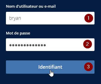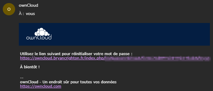 Pour réinitialiser votre mot de passe, rendez-vous sur https://owncloud.bryancrighton.fr et saisissez votre nom d’utilisateur ou votre adresse e-mail, un mot de passe au hasard, et cliquez sur « Identifiant » :